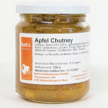Das Apfel-Chutney aus dem Sortiment von Ruth’s Delikatessen passt perfekt zu Fondues, Raclettes und Grilladen aller Art.