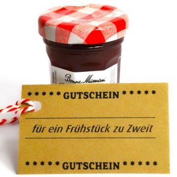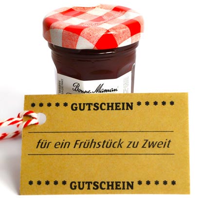 Ein 30 Gramm Gläschen feinster Bonne Maman Konfitüre mit einem Gutschein für ein Frühstück zu Zweit. So macht schenken doppelt Spass!