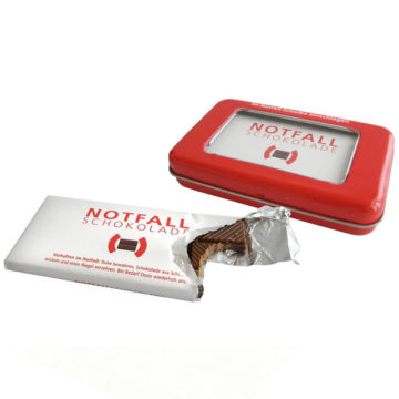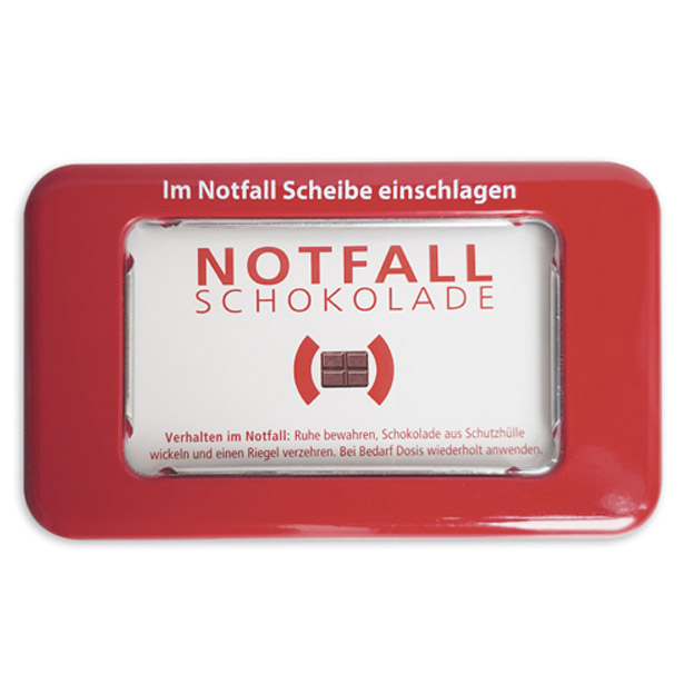 Verhalten im Notfall: Ruhe bewahren, Scheibe einschlagen und die Schokolade aus der Schutzhülle wickeln und den Riegel verzehren.
