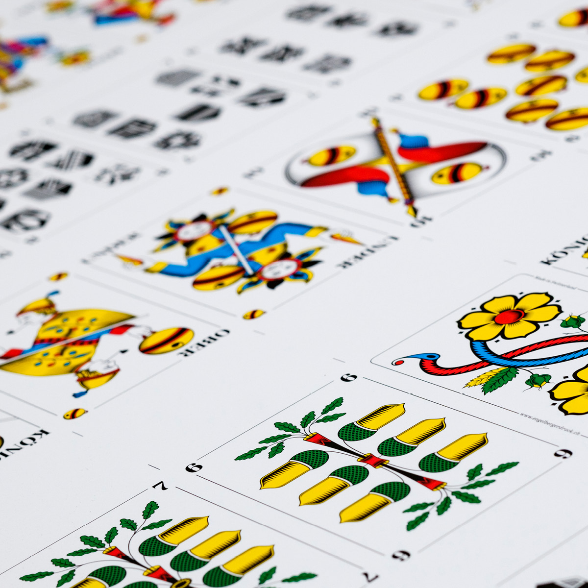 Schweizer Jass mit Deutschweizer Bild. Klassisches Bild mit schönen Kontrasten, klaren Kanten und optimierter Typografie. Spielkartenpapier lackiert mit hochwertigem Spielkartenlack.