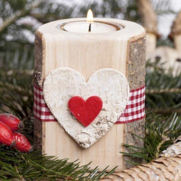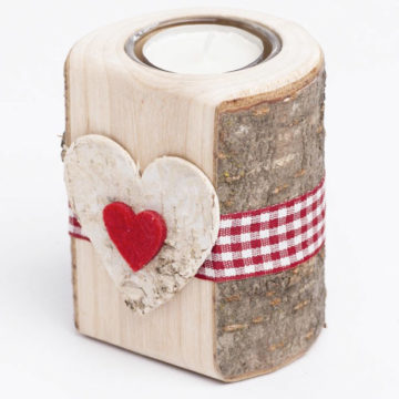 Durch den Glaseinsatz wirkt diese Holzdeko noch edler und macht den Teelichthalter zu etwas ganz besonderem. Verziert haben wir das Ganze noch mit einem karierten Dekoband, einem aus Birkenrinde ausgeschnittenen Herz sowie einem tollen Herz-Motiv aus Filz.
